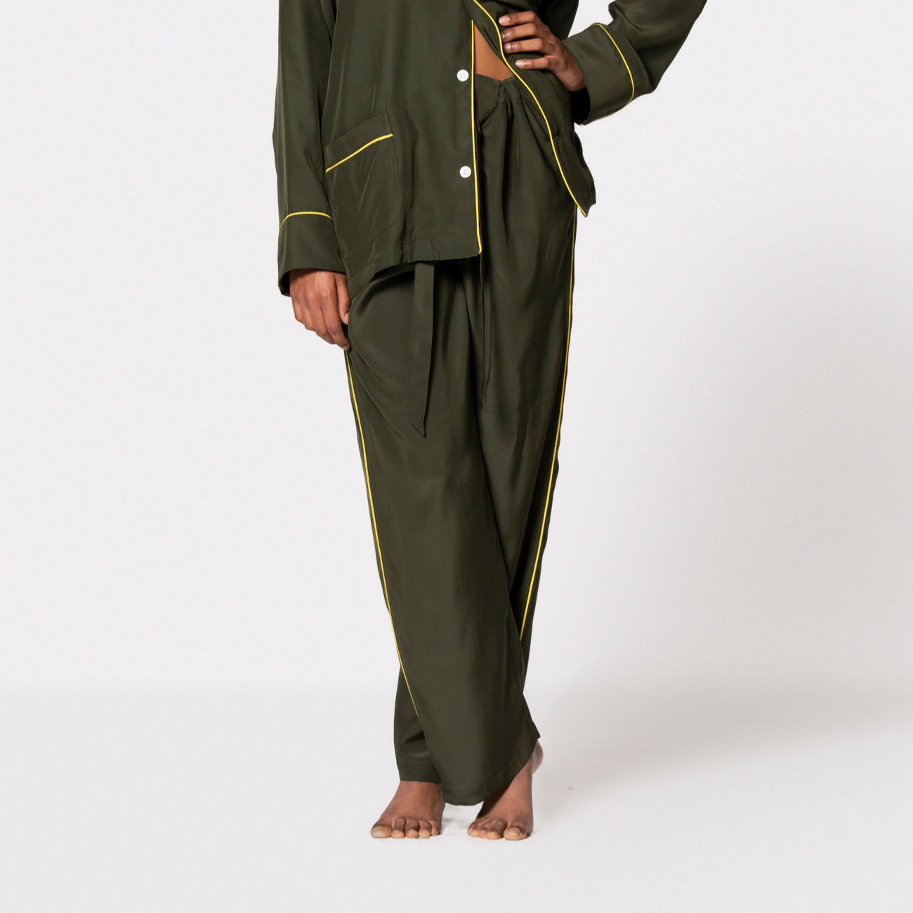 The Leisurewear Set, The Pant, and The Robe are to Dry Clean Only.