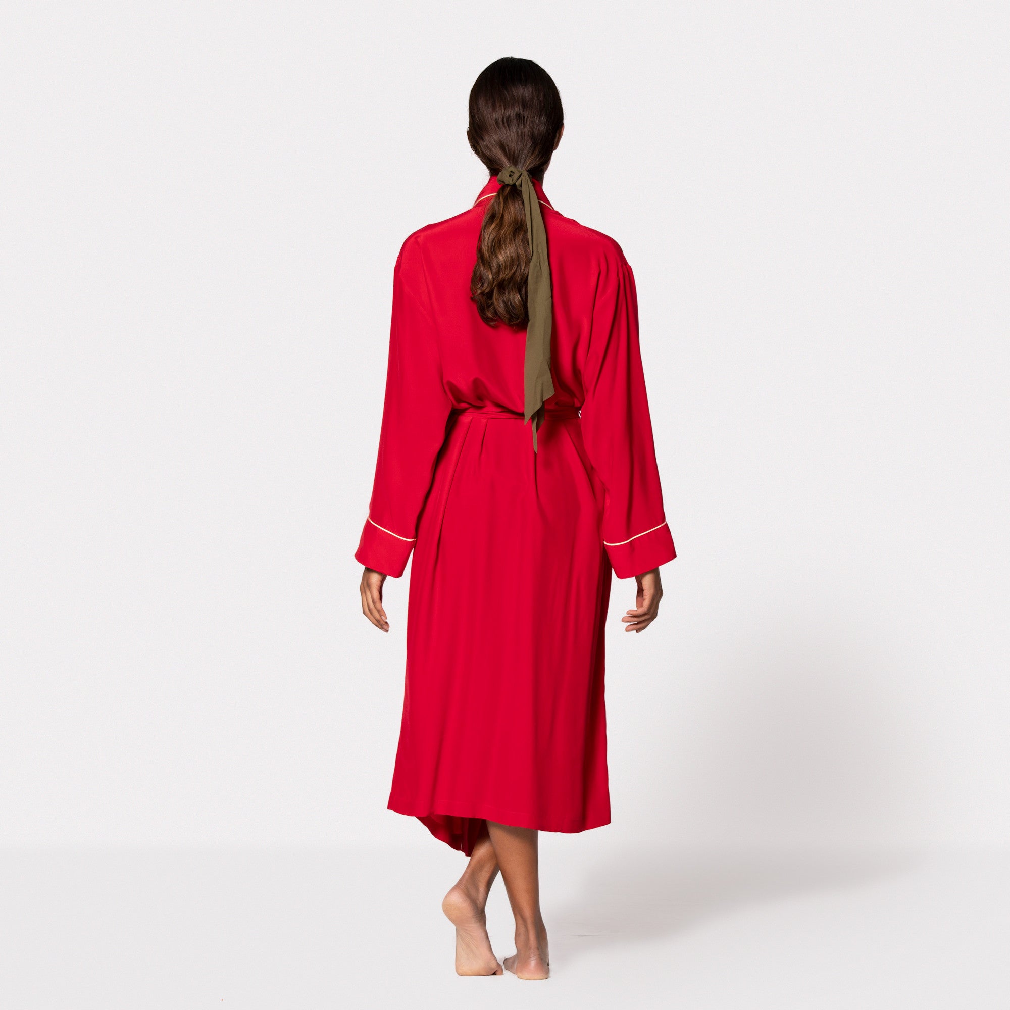 Model is 5'9" and is wearing a size Medium, The Robe in Red.