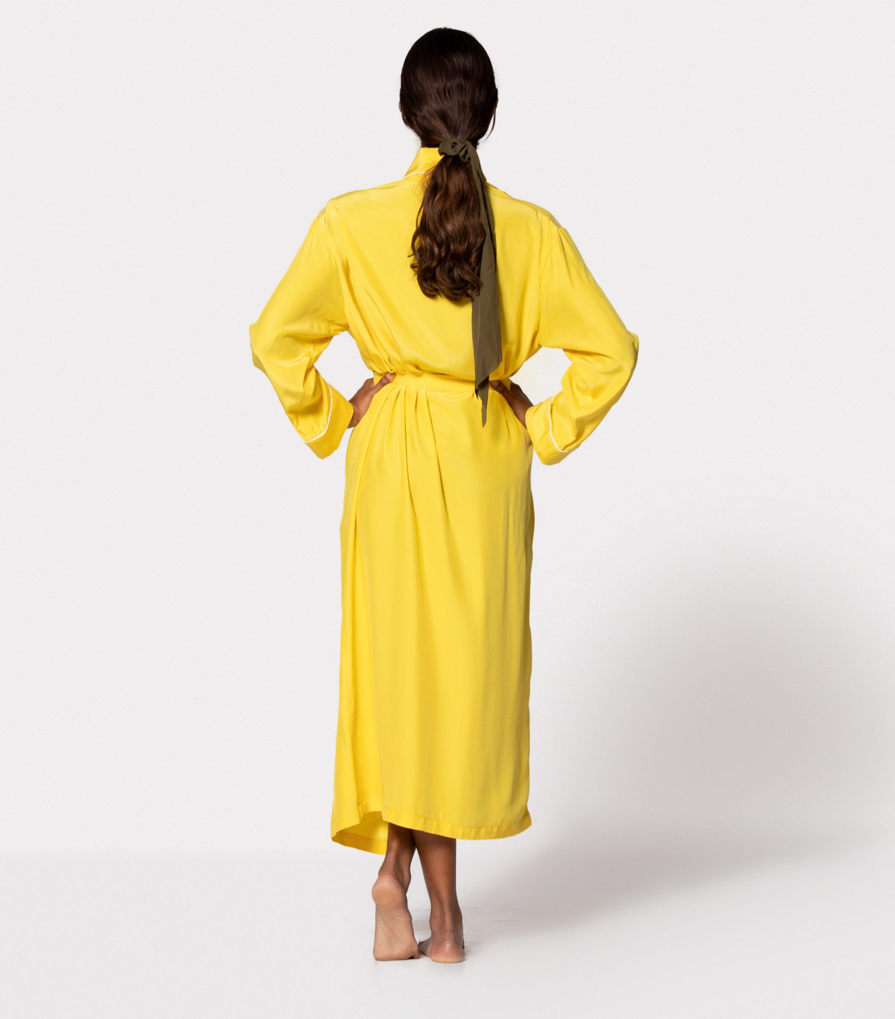 Model is 5'10" and is wearing a size Medium, The Robe in Yellow.